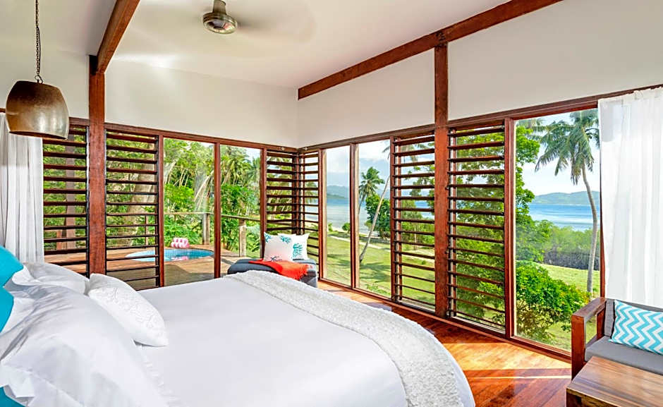 Located on the waterfront with a large deck and a private plunge pool, this villa features two separate bedrooms, each with an private bathroom. It has a kitchenette with a full-size refrigerator. Please note that children over the age of 12 can be accommodated in this villa. Please note the rate is based on 2 guests. Two additional guests can be accommodated on a King or 2 single beds for an additional charge.